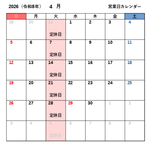 各曜日の営業時間や営業時間変更等については下記サイトをご覧ください。