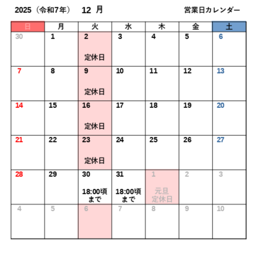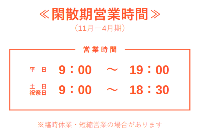 各曜日の営業時間や営業時間変更等については下記サイトをご覧ください。